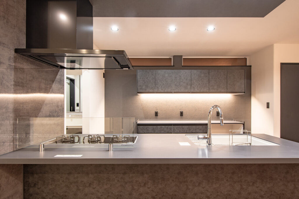 さらに、カップボード吊り戸下には間接照明を仕込み、より高級感のあるキッチンに仕上げています。