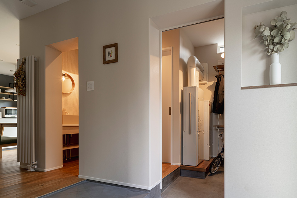 今回のこだわりポイントのひとつは、玄関からリビングの奥まで続く大きな土間空間だ。自転車や観葉植物のほか、アラジンのストーブが置かれている。「みんなで火を囲んでほっとできる空間をつくりたかったんです。いずれ薪ストーブを入れるのが夢ですね」。