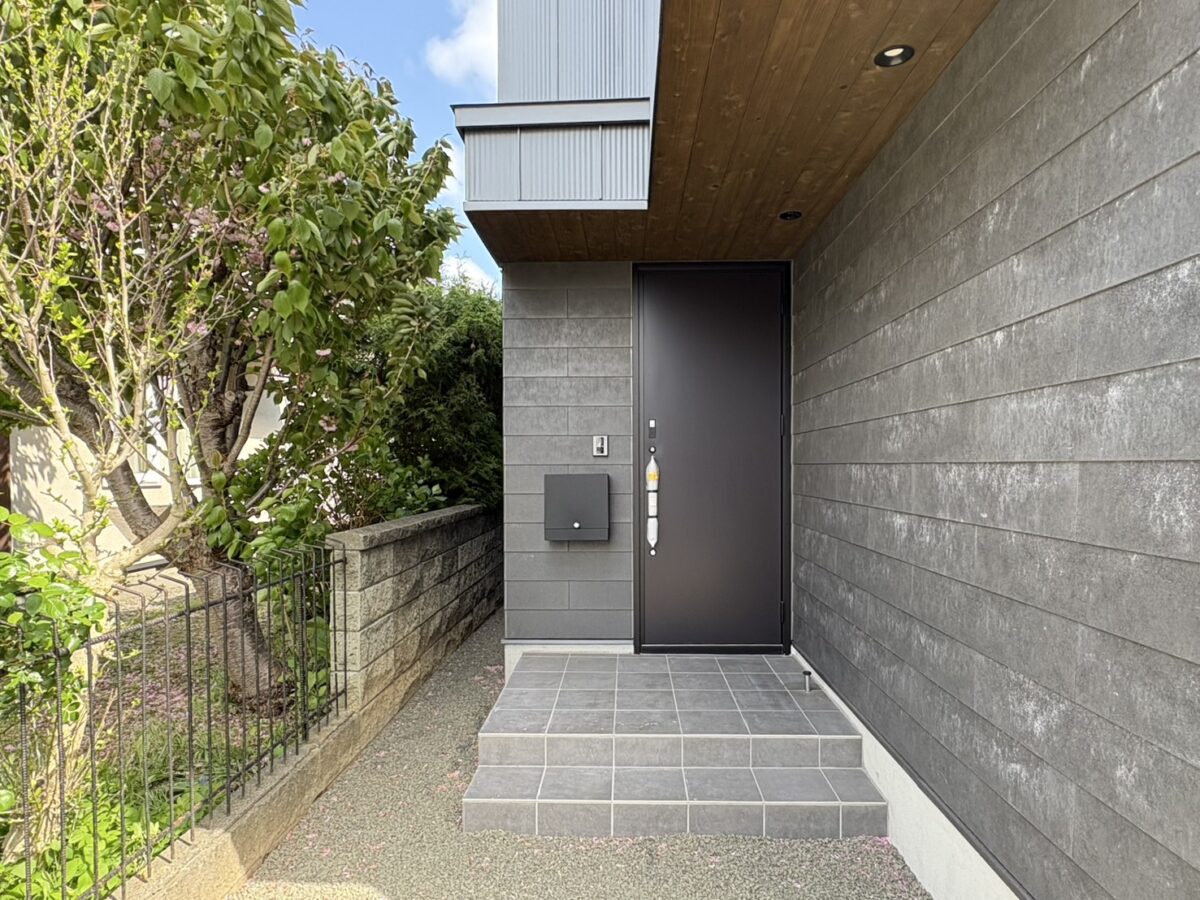 玄関まわりには、KMEWのSOLIDOと軒天に杉板を貼って素材の違いを楽しめます。